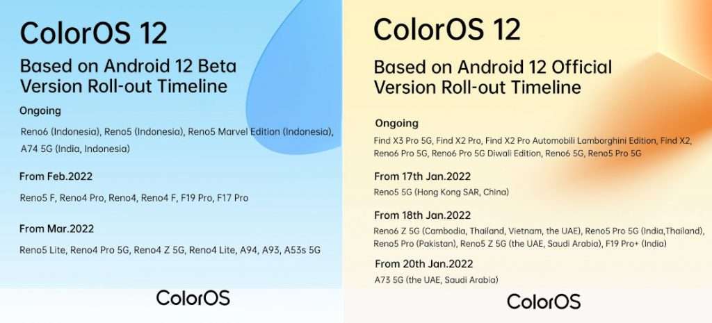 Mentre la versione stabile di ColorOS 12 è già disponibile per OPPO Find X2, OPPO Reno6 Pro 5G, OPPO Reno6 Pro 5G Diwali Edition, OPPO Reno6 5G e OPPO Reno5 Pro 5G, a partire dal 18 gennaio inizierà a fare la sua comparsa anche su OPPO F19 Pro+. Per quanto riguarda la versione beta, invece, durante il mese di febbraio è attesa su OPPO Reno4 Pro, OPPO F19 Pro e OPPO F17 Pro; dal mese di marzo l’aggiornamento software arriverà poi su OPPO A53s 5G.