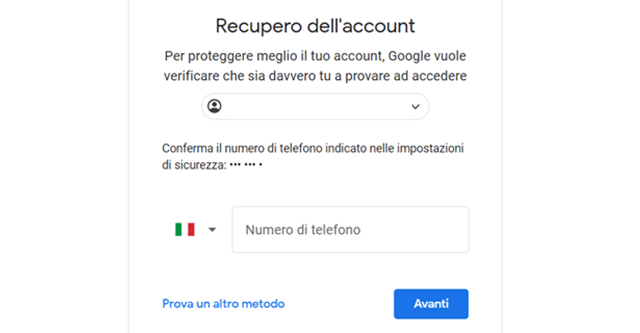 - Riempire il campo “Inserisci l’ultima password che ricordi di aver utilizzato per questo Account Google” o premere “prova un altro metodo”