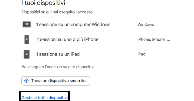 In questa pagina è possibile visualizzare, controllare ed eliminare, tutti i dispositivi attualmente in uso. Inoltre, è possibile controllare anche i dispositivi degli ultimi 28 giorni da cui si è effettuato l’accesso. Per ulteriori dettagli, è possibile seleziona un dispositivo o una sessione, così da visualizzare anche l’orario, il luogo e la sessione attiva.