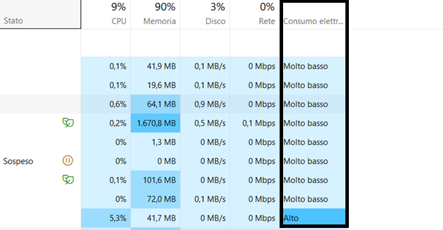 Dopodiché, è necessario attendere qualche istante affinché Windows raccolga e visualizzi i dati relativi all’alimentazione. Le colonne appena aggiunte mostreranno quali applicazioni richiedono maggiore energia dalla batteria, classificando il consumo in base a cinque livelli: Molto basso, Basso, Moderato, Alto e Molto alto. Questo permetterà di identificare rapidamente le applicazioni che incidono maggiormente sull’autonomia del dispositivo, consentendo di prendere provvedimenti per ottimizzare l’uso delle risorse energetiche.