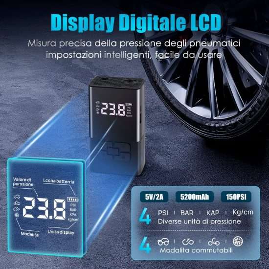 Un prodotto super compatto, che può tornare utile in una marea di contesti. Super pratico, basta avere l’accortezza di mantenere carica la batteria, così da poterlo sfruttare senza il vincolo dei cavi. Grazie alla regolazione automatica, basta scegliere il tipo di operazione da svolgere e il manometro si regolerà in automatico. Una volta raggiunta la giusta pressione, si fermerà in automatico.