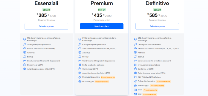 Internxt mette a disposizione piani a vita fortemente scontati, con sconti che possono arrivare fino all’85%. Nel dettaglio, il pacchetto da 1 TB è acquistabile a 285 euro, quello da 3 TB è proposto a 435 euro, mentre la versione più capiente da 5 TB è disponibile al prezzo di 585 euro. In tutti i casi si tratta di un pagamento unico, senza canoni mensili o annuali da sostenere in futuro, a differenza delle classiche soluzioni in abbonamento.