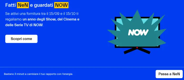 Molto interessante l’iniziativa di NeN, uno dei fornitori di luce e gas più convenienti sul mercato. In cosa consiste? Puoi bloccare il prezzo dell’energia a tariffe super vantaggiose per ben 10 anni e ricevere un anno di NOW gratis, la piattaforma streaming con intrattenimento, cinema e serie TV.