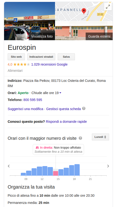 A queste ora si aggiunge anche Big G. Se infatti cerchiamo un supermercato della nostra zona sul motore di ricerca di Google sul lato destro, noteremo che oltre alle informazioni classiche fornite dal colosso di Mountain View, quali indirizzo, orario di apertura e chiusura, telefono e recensioni, ora viene mostrato anche lo stato di affollamento, indicando l’attesa prevista prima di poter entrare nel negozio.