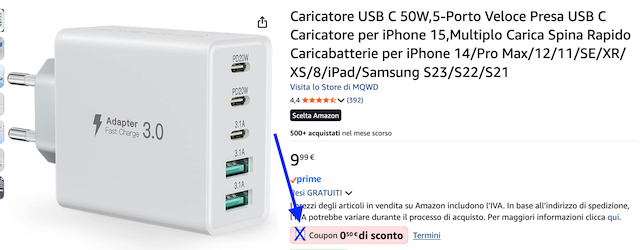 Caricatore GaN da 200W con 6 porte (delle quali 4 di tipo USB C) a 26,99€.