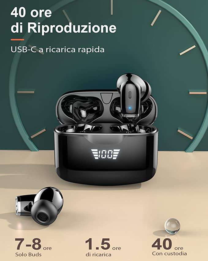 Grazie al comodissimo display a LED potrai facilmente consultare lo stato di ricarica dei tuoi auricolari che potrai utilizzare per un tempo che va dalle 7 alle 8 ore con una singola carica. Con la custodia di ricarica potrai caricare le cuffiette Bluetooth 4-5 volte e potrai estendere la durata della batteria a 40 ore.