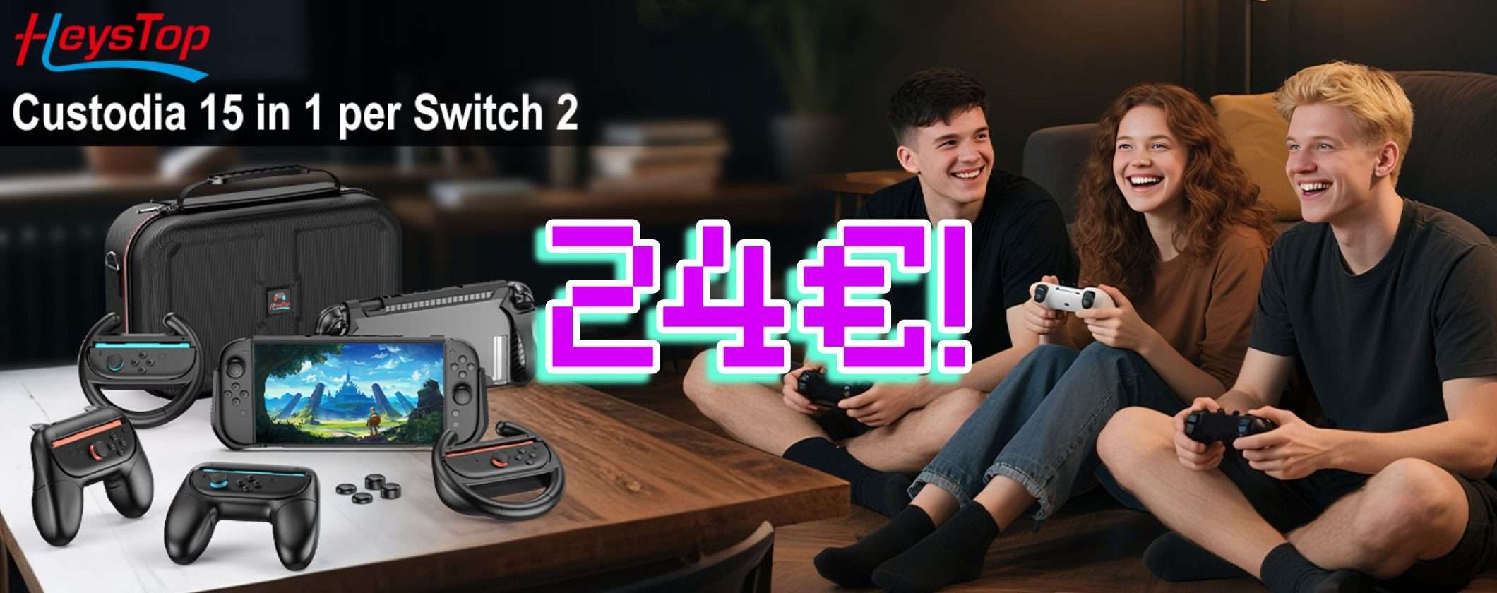 Oggi con soli 24 euro su Amazon acquisti non solo una fantastica Custodia per Nintendo Switch 2, ma anche tantissimi fantastici accessori inclusi al suo interno. A questo prezzaccio ti assicuri anche due gamepad porta JoyCon, due Volanti porta JoyCon, una cover antiscivolo, un vetro temperato per il display e 6 copri leve analogiche! Cosa stai aspettando? Acquista questa promo su Amazon!