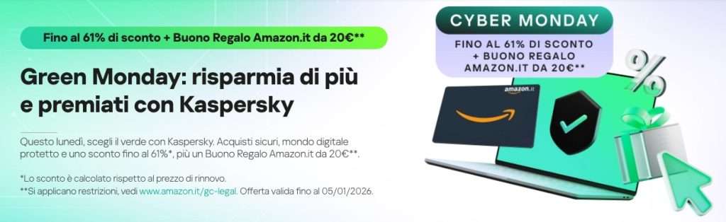 In occasione del Cyber Monday è possibile attivarlo ad un prezzo veramente interessante: il primo anno costa 34,99 € invece di 84,99 €, grazie ad uno sconto del 58%, e all’acquisto viene inviato all’utente anche un buono Amazon da 20€. L’adesione si completa direttamente sul sito ufficiale di Kaspersky. Scegliendo il piano da 20 dispositivi, lo sconto arriva addirittura al 61%. Ma attenzione, c’è tempo solo fino al 5 dicembre.