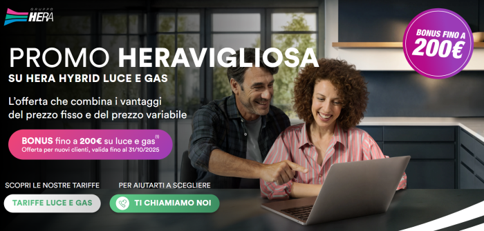 Tra i fornitori di energia uno dei più convenienti è Hera, che in questo momento ha lanciato un’offerta veramente molto interessante. La promo prevede l’applicazione di un prezzo fisso di luce e gas fino ad una certa soglia di consumo e poi variabile, in base all’andamento del mercato all’ingrosso.