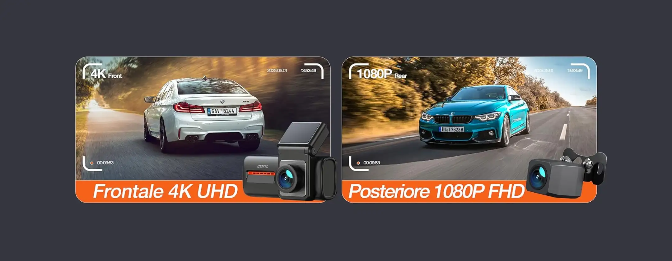 Quindi, una delle particolarità della dash cam 4K iZEEKER è che offre una doppia registrazione. Infatti, oltre alla dash cam frontale avrai anche una dash cam posteriore da installare. Niente male vero? Tutti e due i dispositivi di ripresa sono resistenti al calore e al freddo, così da poterli mantenere installati anche quando l’auto è parcheggiata, in caso di danni possono riprendere ciò che succede.
