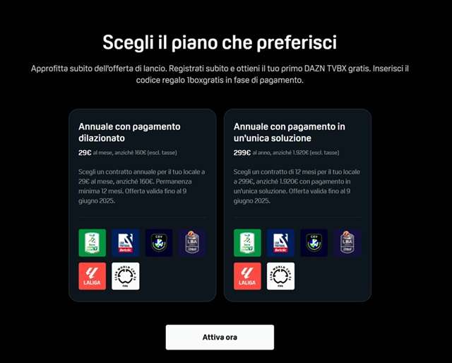 Sempre nell’ambito della promo di lancio, inserendo il codice promo 1boxgratis in fase di pagamento è possibile ottenere il primo DAZN TV BOX gratis.