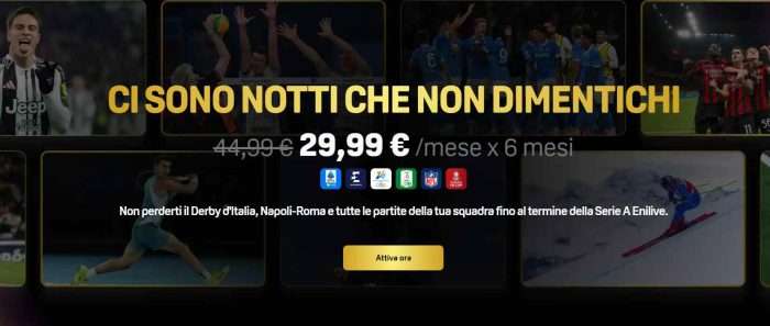 Terminato il periodo promozionale, l’abbonamento continuerà alle condizioni economiche vigenti al momento del rinnovo, salvo disdetta. La visione è consentita su due dispositivi contemporaneamente se collegati alla stessa rete domestica, mentre il singolo device può essere utilizzato anche fuori casa.
