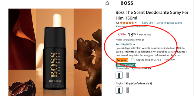 Boss The Scent, deodorante spray da 150 ml a 11,12€ con il coupon.