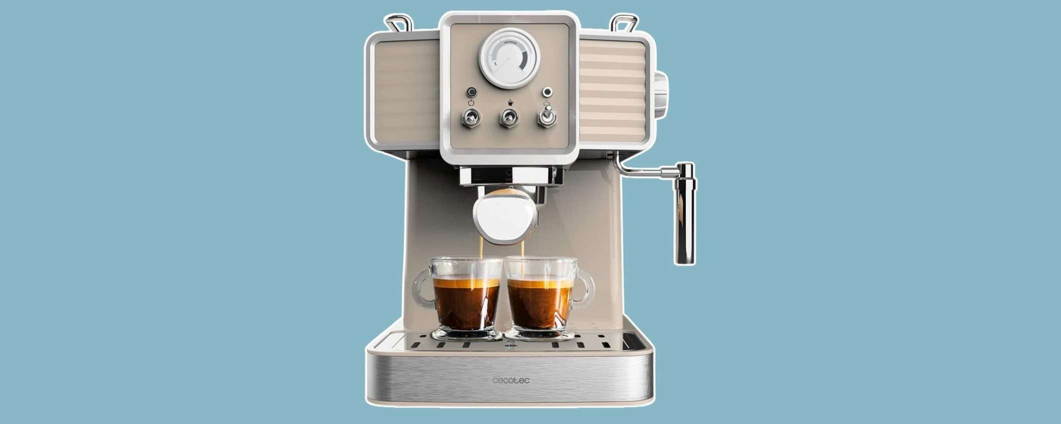 La macchina da caffè Cecotec protagonista di questa offerta su Amazon è una piccola meraviglia per gli amanti del vintage: color crema, manometro analogico e finiture palesemente retrò, include tutto quello che serve per preparare un buonissimo espresso o un cappuccino cremoso come al bar. Puoi acquistarla a 58,90 euro invece di 89,90, con consegna immediata.