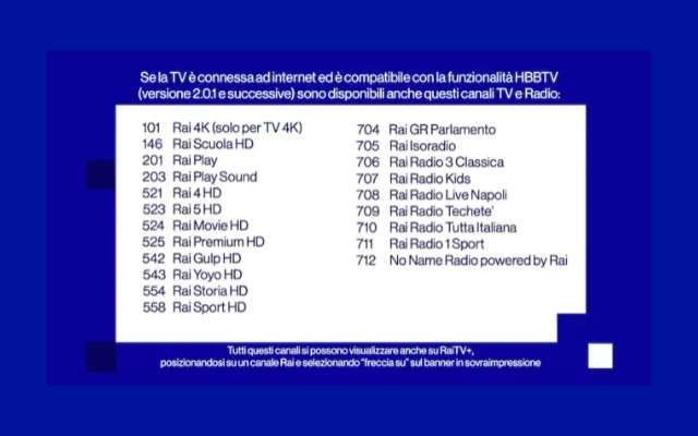 È possibile accedervi navigando tra i canali disponibili sul digitale terrestre con televisore o decoder connesso a internet. Ovviamente l’apparecchio deve essere anche compatibile con la versione HbbTV 2.0.2 o successive. In ogni canale compatibile visualizzerai il comando per accedere all’applicazione Rai Tv+. Una volta premuta la “freccia su” del telecomando accederai a tantissimi contenuti multimediali e interattivi.