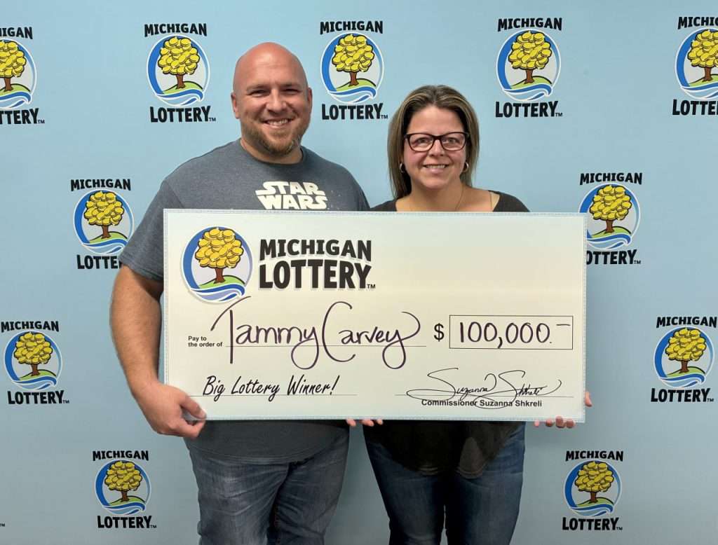 Tammy Carvey e il marito con il simbolico assegno da 100 mila dollari / Credits: milotteryconnect.com