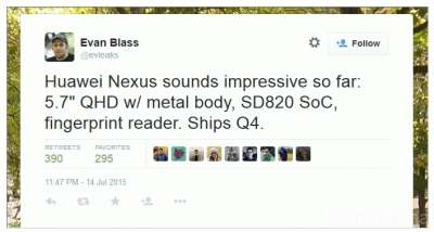 Adesso è nuovamente Blass a prendere la palla, pubblicando sul suo account Twitter un nuovo tweet nel quale, oltre a confermare l'utilizzo del processore Qualcomm Snapdragon 820, aggiunge che Huawei Nexus avrà un display da 5,7 pollici QHD e lettore di impronte digitali. Infine, scrive che la data di uscita del dispositivo sarà nel quarto trimestre del 2015.