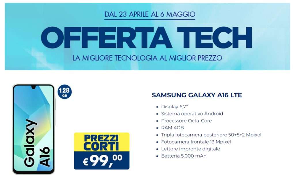 Tornano le offerte tech di Esselunga: fino al 6 maggio, nei punti vendita, un minimo storico per un ottimo smartphone medio gamma che, a questo prezzo, è difficile da eguagliare. Parliamo di Samsung Galaxy A16 LTE da 128 GB, disponibile a soli 99 euro grazie ai prezzi corti proposti dall’insegna. Un prezzo, come dicevamo, decisamente competitivo, soprattutto considerando che il listino di lancio superava i 200 euro.