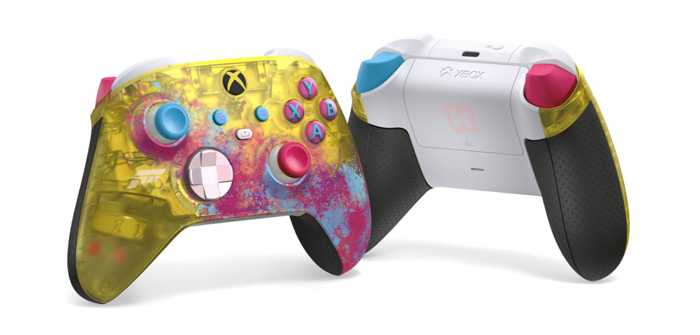 Il controller in edizione limitata uscirà in contemporanea con l’esclusiva Microsoft, è già disponibile in pre-ordine sul sito ufficiale al prezzo di 69,99€. Il design del nuovo controller di certo non passa inosservato, davanti troviamo una finitura gialla trasparente con alcuni schizzi di colore rosa e azzurri, mentre sul retro c’è un’impugnatura antiscivolo che richiama la trama di uno pneumatico. I trigger dorsali RT e LT si tingono di rosa e azzurro, a contrasto con la scocca bianca sul retro.