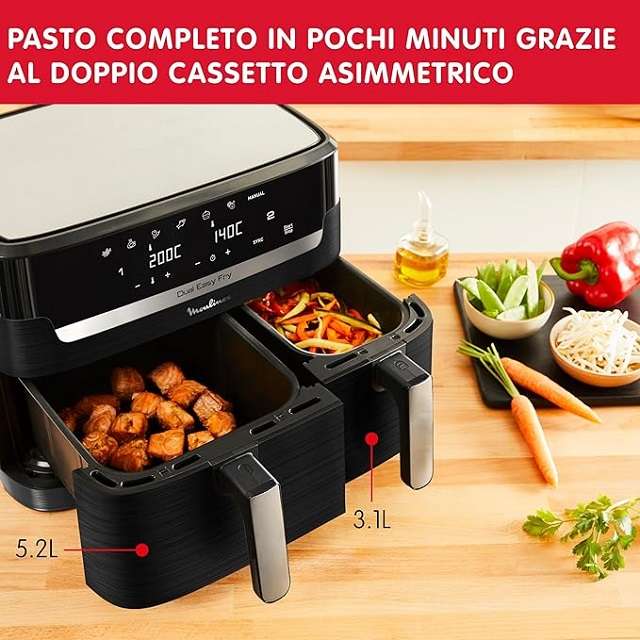 Grazie alla presenza del doppio cestello avrete la possibilità di cuocere contemporaneamente due pietanze diverse, pronte in una sola volta. I cestelli sono adatti a qualsiasi tipo di cibo da quello più semplice a quello più complesso, capiente per tutta la famiglia grazie alle sue dimensioni XXL da 5,2 L e 3,1 L, in modo tale da utilizzare nel caso solo quello più piccolo e ridurre al minimo il consumo energetico.
