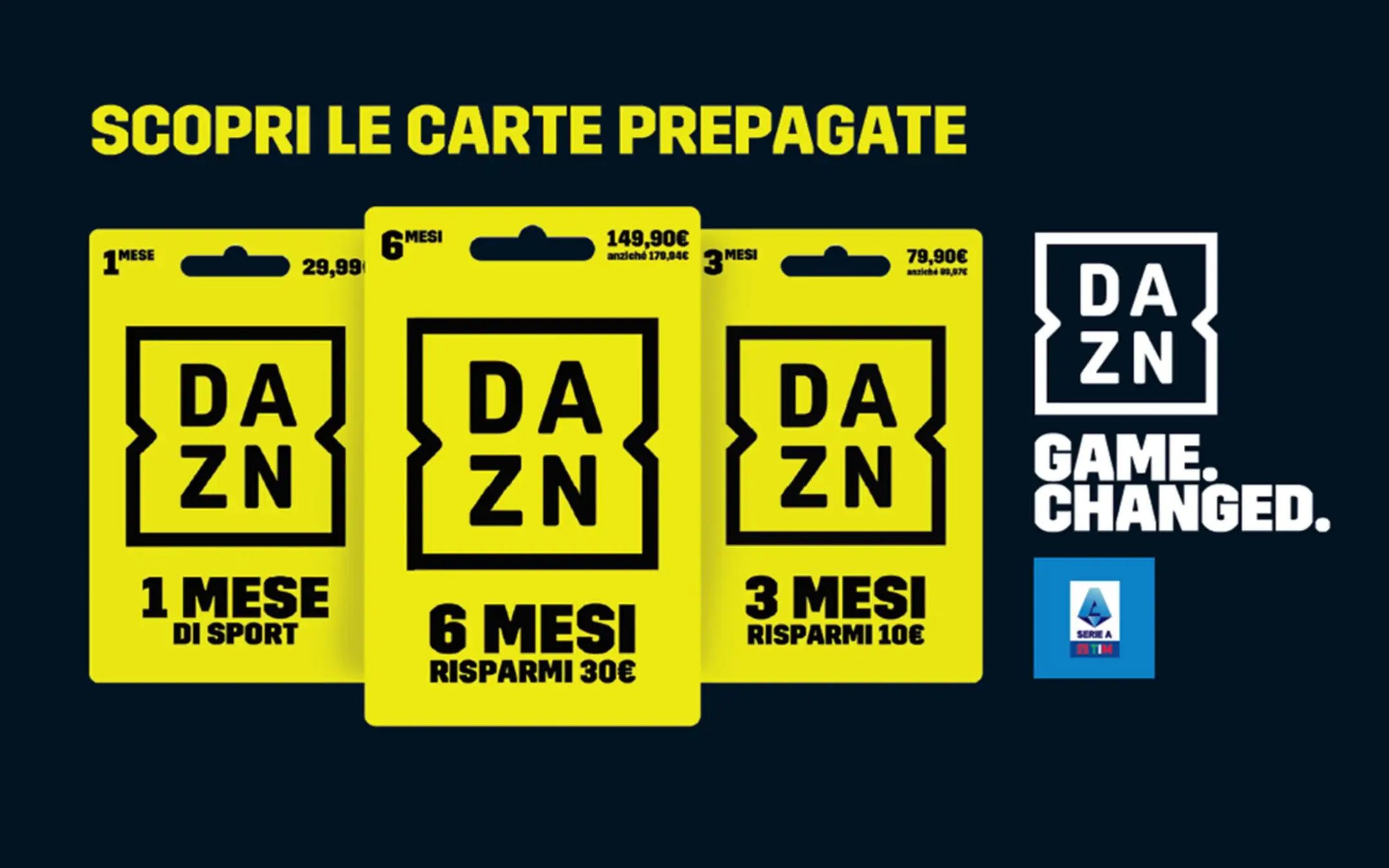 - Carta prepagata DAZN – 3 Mesi: la seconda opzione ha un risparmio di 10 euro rispetto al tradizionale abbonamento. La prepagata valida per un trimestre è disponibile a soli 79,90 euro.
