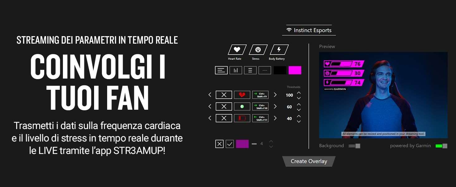 La differenza tra Garmin Instinct Esports Edition e altri modelli è questa incredibile funzione che tiene traccia delle tue partite, analizzando i dati del tuo corpo mentre giochi. E grazie all’app STR3AMPUP, puoi trasmettere i dati sulla tua frequenza cardiaca e il livello di stress nelle tue live, in tempo reale.