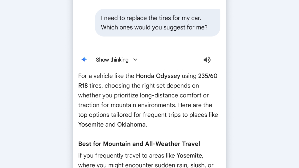 Google fornisce un esempio concreto: chiedendo a Gemini la misura degli pneumatici di un minivan Honda del 2019 mentre si è in coda dal gommista, l’assistente non solo recupera i dati tecnici, ma suggerisce opzioni diverse in base all’uso quotidiano o a viaggi in tutte le stagioni, collegando le informazioni a viaggi familiari individuati in Google Photos e integrando valutazioni e prezzi.