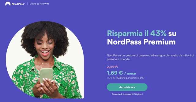 Puoi aderire all’ultima offerta su NordPass Premium su questa pagina del sito ufficiale: se il servizio non dovesse soddisfare le tue aspettative, hai diritto a richiedere il rimborso completo entro 30 giorni dall’acquisto.