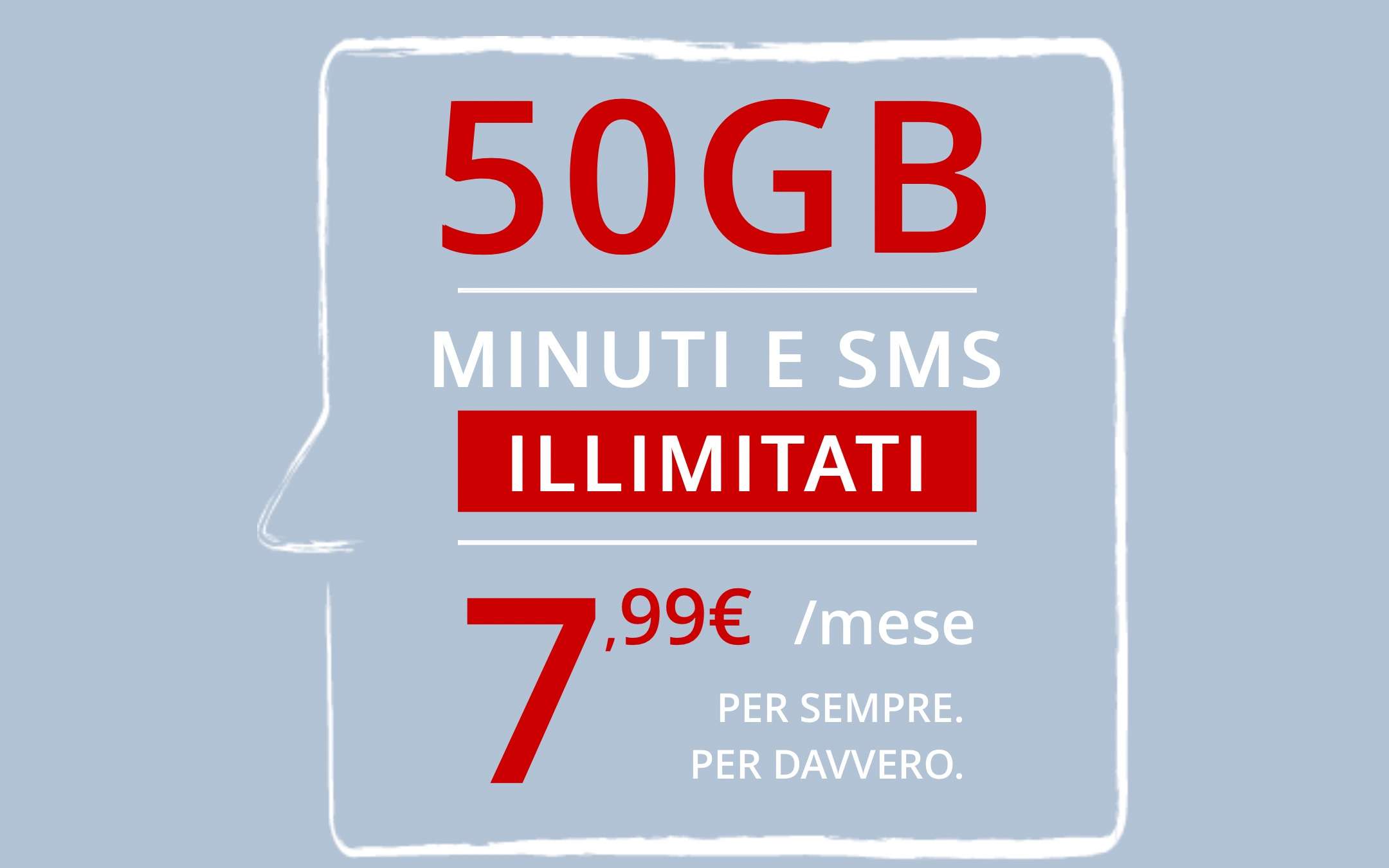 L’offerta del quarto operatore prevede minuti e SMS illimitati verso tutti, 50GB al costo mensile di 7,99€, con la consueta promessa: per sempre, per davvero. Come tutte le tariffe di Iliad anche questa comprende nel costo del mese alcuni servizi extra come la Segreteria Telefonica, l’hotspot, il blocco dei servizi a sovrapprezzo e il servizio di reperibilità Mi Richiami. Inoltre, sono disponibili in roaming ben 4GB dedicati alla navigazione nel territorio europeo.