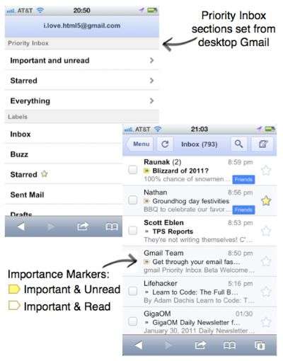 Gmail Priority Inbox per iOS Gmail Priority Inbox è ora disponibile nella versione web app per i telefoni Android ed iPhone, ovvero per i devices che supportano il linguaggio HTML5.