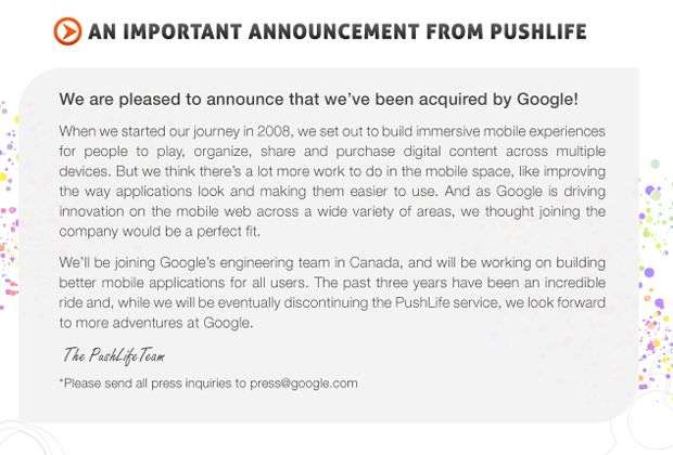 Google ha acquisito PushLife, società canadese fondata nel 2008 da un ex dipendente della Research in Motion.PushLife consente di gestire e sincronizzare facilmente sfondi, musica, video e suonerie su smartphone Symbian, BlackBerry ed Android.Secondo quanto riportato da StartupNorth, il prezzo pagato da "Big G" sarebbe stato di circa 25 milioni di dollari.
