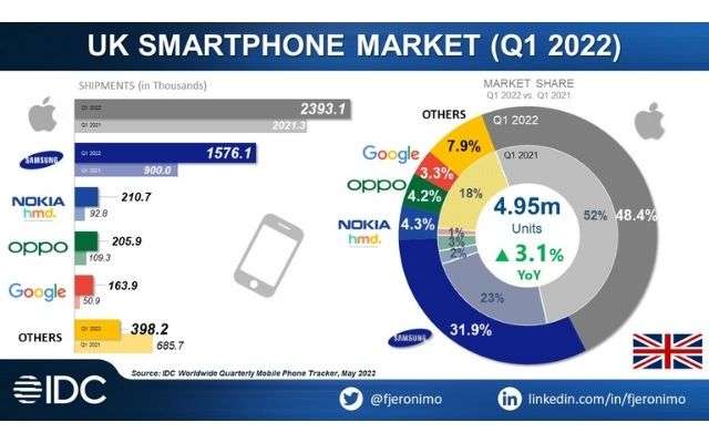 The UK smartphone market was up 3.1% YoY in 1Q2022 to 4.9m units. Apple & Samsung represent 80% of volume & 89% of value. Interesting to see new brands in the Top5: