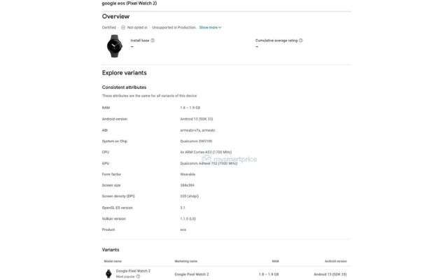 Dal Play Console di Google vediamo anche le specifiche chiave e un rendering di piccole dimensioni dell’orologio. Avrà un quadrante circolare, una corona rotante sul frame destro e avrà un pannello con risoluzione di 384 x 384 pixel con 324 DPI al seguito. Sotto la scocca troverà posto un processore Qualcomm SW5100 composto da quattro core Cortex A53 coadiuvati da una GPU Adreno 702. Questo chipset dovrebbe essere il famigerato Snapdragon W5+ Gen 1 di cui abbiamo sentito parlare in passato. Il tutto sarà affiancato poi, da 2 GB di memoria RAM. Non mancherà Android 13 con WearOS 4.0. Ci saranno, come sempre, due iterazioni: una solo Wi-Fi e una con modulo LTE. Inoltre, troveremo ben quattro cinturi al lancio. La batteria infine, sarà una cella energetica da 306 mAh.