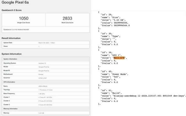 Per quanto riguarda il punteggio raggiunto sulla piattaforma – un valore che ha poca significato per stimare le prestazioni nell’utilizzo quotidiano -, il telefono di Google segna 1050 punti in single core e 2883 punti in multi core. Com’è ovvio che sia Google Pixel 6a sarà una versione “contenuta” di Google Pixel 6 series: è atteso con un sensore principale Sony IMX363 da 12 MP con di fianco un sensore ultra grandangolare Sony IMX396 da 12 MP; frontalmente si presume troverà posto un sensore Sony IMX355 da 8 MP.