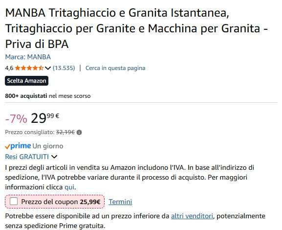 Questa macchina tritaghiaccio è il regalo perfetto da farsi per l’estate: con questo accessorio potrai semplicemente inserire il ghiaccio, girare la manovella e avere in pochi secondi quello che serve per preparare granite, frappé o altri drink freddi perfetti per queste giornate calde. Con lame in acciaio che tagliano velocemente e in modo uniforme, oggi la acquisti a soli 25,99 euro su Amazon, attivando il coupon come mostrato da questa immagine.