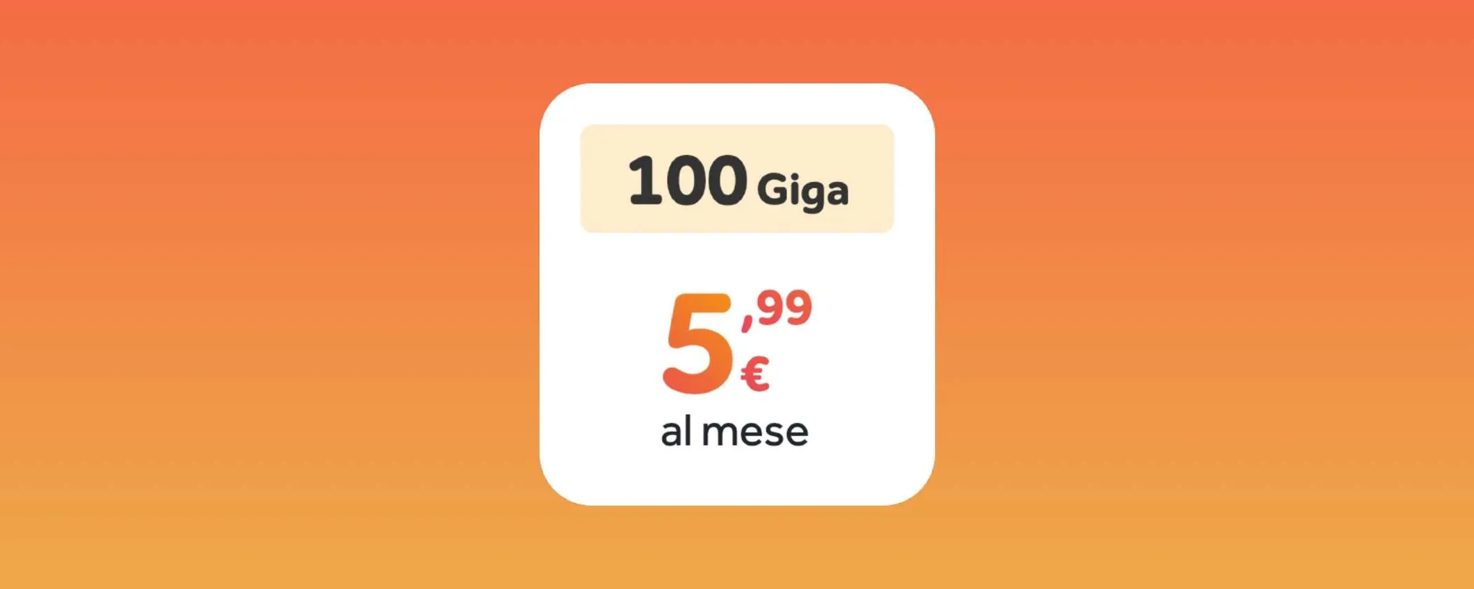 Con questa promozione puoi usufruire ogni mese di 100 Giga di internet su rete Vodafone con velocità bloccata a 30 Mbps sia in download che in upload, minuti senza limiti e senza scatto alla risposta verso tutti i numeri sia di rete fissa che di rete mobile in tutta la Penisola e SMS sempre illimitati e verso qualsiasi operatore mobile nazionale. Tutto questo per soli 5,99 euro ogni mese. A disposizione, sempre compresi nel canone mensile, troviamo anche 5,5 Giga di traffico dati da utilizzare ogni mese in roaming. Altra chicca, è la possibilità di far ripartire la promozione in anticipo se ad esempio termini i Giga.