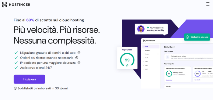 Il pacchetto include fin da subito servizi essenziali come la migrazione gratuita di domini e siti, risorse completamente scalabili, IP dedicato e assistenza clienti attiva 24 ore su 24, pensata per supportare anche i progetti più esigenti. Tra i benefici immediati che Hostinger garantisce ci sono anche: