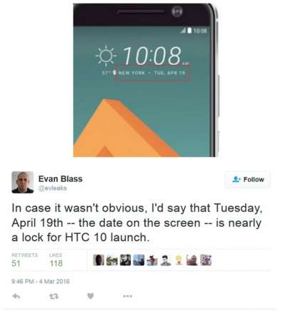 Anche per questo la società sta inizando il battage pubblicitario, spingendo con teaser postati con l'intenzione di stuzzicare la curiosità dei consumatori. Proprio da una di queste immagini, arrivate in mano a un leaker attendibile, Evan Blass (@evleakes), si evincerebbe la data di presentazione dell'HTC 10.