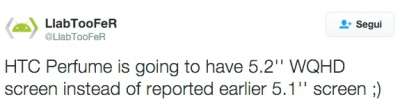 Come si può leggere dal tweet, HTC M10 Perfume dovrebbe integrare un display da 5,2 pollici di diagonale con risoluzione WQHD (2.560 x 1.440 pixel). Un netto passo in avanti se paragonato a One M9, dotato di un pannello da 5 pollici Full HD (1.920 x 1.080 pixel). Sotto la scocca sarà presente un SoC quad-core Qualcomm Snapdragon 820, assistito da ben 4GB di memoria RAM. Il comparto fotografico, invece, potrà contare su un sensore posteriore da 12 megapixel di tipo UltraPixel.