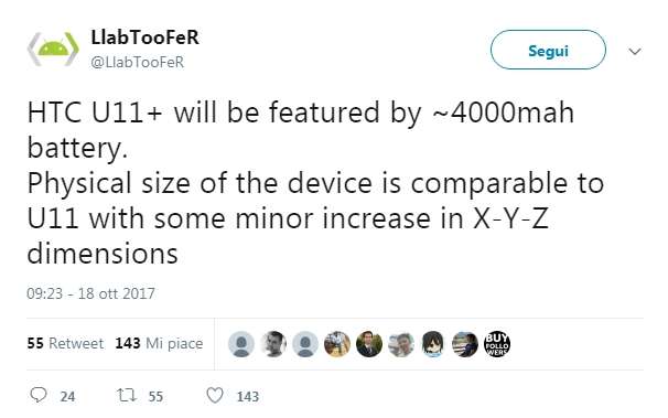 Secondo quanto riferito, il nuovo smartphone avrà una generosa batteria di circa 4.000 mAh e dovrebbe essere solo un po' più grande dell'HTC U11, rilasciato nel maggio di quest'anno. Questi dettagli sono stati condivisi su Twitter dallo sviluppatore di ROM LlabTooFeR, che di solito è molto affidabile quando si tratta di informazione riguardanti il produttore taiwanese.