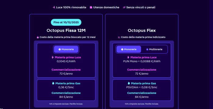 Si tratta di Octopus Fissa 12M, un’offerta che congela per un anno il costo dell’elettricità a 0,1045 €/kWh e quello del gas a 0,36 €/Smc, così da proteggere la bolletta da eventuali rialzi nei prossimi mesi. La promozione è riservata alle attivazioni online attraverso il sito ufficiale del fornitore.