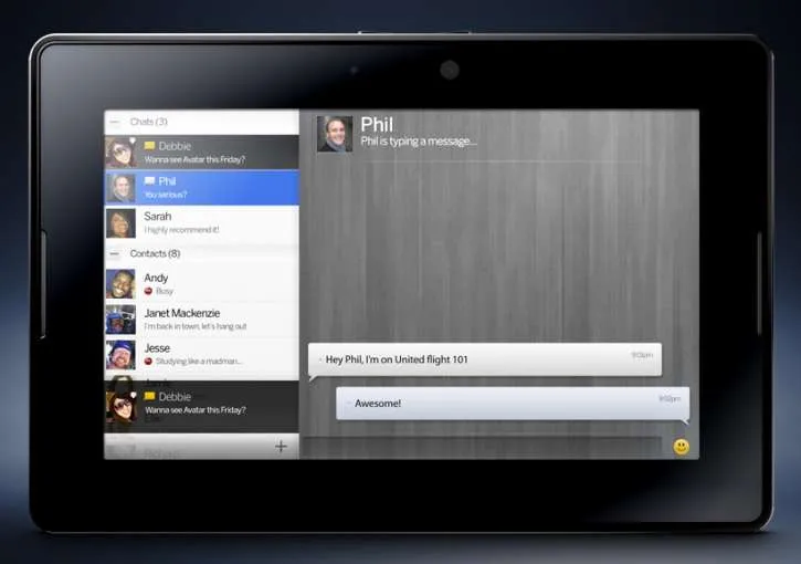 Il BlackBerry PlayBook vanta un display da 7 pollici WSVGA (1024 x 600 pixel) a tecnologia capacitiva e supporta il multitouch e il gesture control.