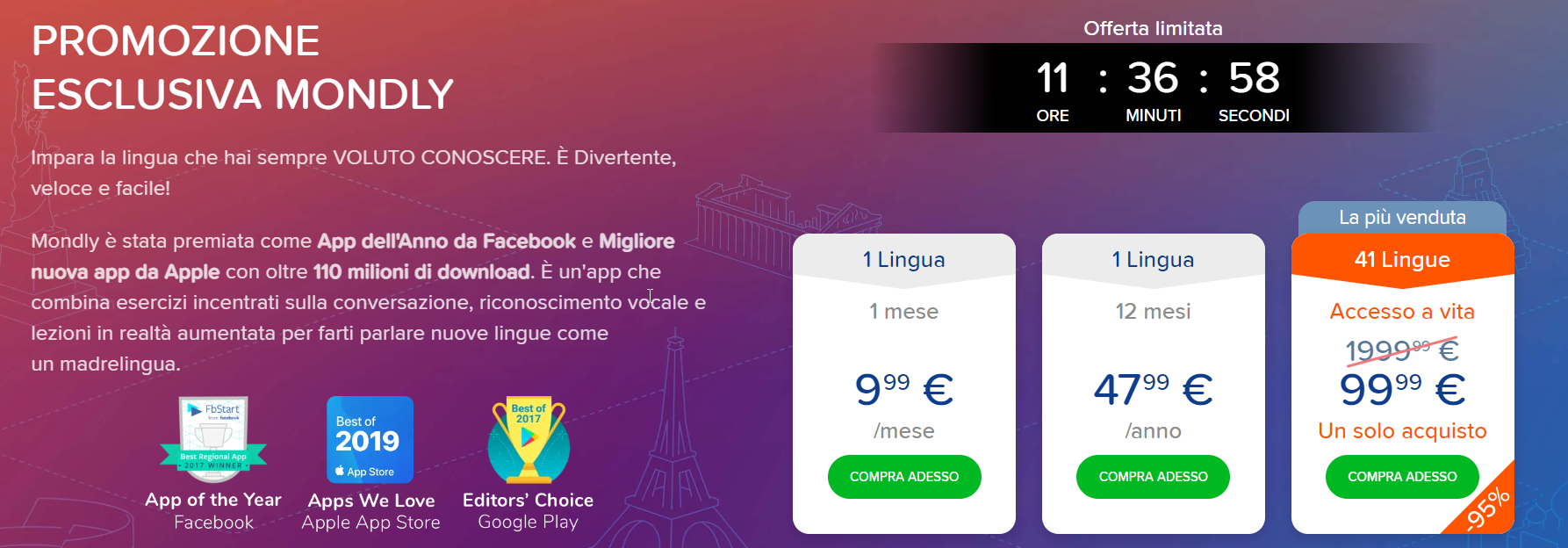 La promozione attuale rende il piano a vita di Mondly un’opportunità imperdibile per tutti coloro che desiderano ampliare i propri orizzonti linguistici. Con un investimento di soli 99,99 euro, dovuto allo sconto del 95%, è possibile accedere a un mondo di conoscenza che rimarrà a disposizione per sempre. Non lasciatevi sfuggire questa occasione: oltre allo sconto, Mondly AR e Mondly Kids sono gratis!