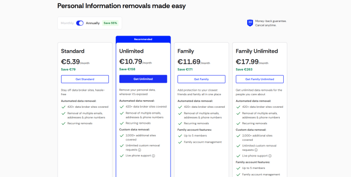 - Unlimited: 10,79 euro al mese, con possibilità di richiedere la cancellazione dei dati da qualsiasi sito individuato;