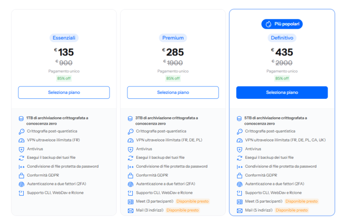 E ora viene il bello: c’è una promo attiva con sconti fino all’85% su tutti i piani a vita. Sì, hai letto bene. Paghi una volta, non ci pensi più, e ti porti a casa fino a 5TB di spazio ultra-sicuro con bonus inclusi: VPN e antivirus.Tutto in un colpo solo.