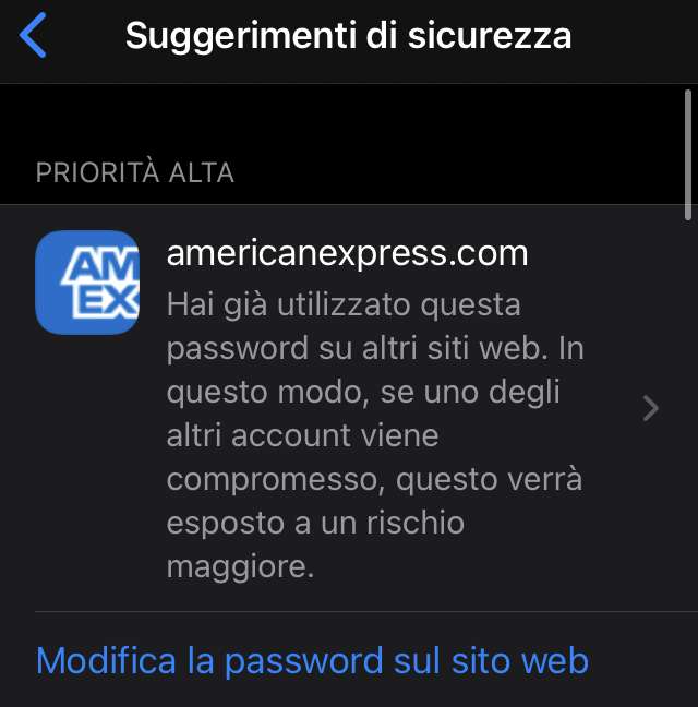 Selezionando la nuova sezione si possono vedere gli eventuali account a rischio di violazione con “Priorità alta”. Nel mio caso mi viene notificato che sto usando una password per l’app American Express per altri siti web.