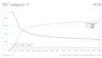 iOS 7, la nuova versione della piattaforma operativa di Apple, è stata installata sul 71% di tutti gli iPhone, iPad ed iPod Touch compatibili a distanza di un mese dal suo rilascio. A rivelarlo sono i dati di Mixpanel. Lo scorso anno, iOS 6 aveva impiegato 30 giorni per raggiungere una percentuale di adozione del 61%.