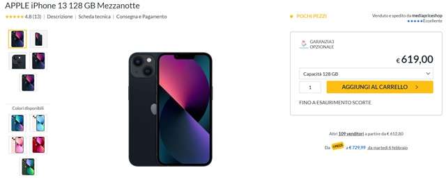 Una delle migliori offerte del giorno è quella che ha per protagonista iPhone 13, in offerta su ePRICE nel taglio da 128GB a 619 euro. Si tratta del prezzo più basso del web: basti pensare che su Amazon lo stesso modello costa 669 euro.