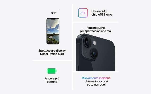 Lasciati sorprendere dall’ottimo Apple iPhone 14 128GB. Grazie al chip A15 Bionic le prestazioni raggiungono livelli incredibilmente alti. App e giochi funzionano alla perfezione, anche in multitasking. Inoltre, il display Super Retina XDR offre immagini sempre ricche di dettagli e ultra colorate. La doppia fotocamera, invece, scatta foto e riprende video da veri professionisti. Goditelo tutto il giorno e oltre con una sola ricarica grazie alla sua batteria super capiente.