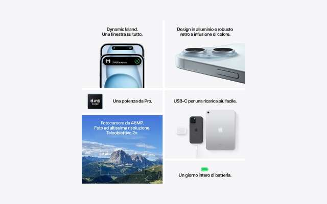 Se sei alla ricerca di uno smartphone pazzesco, bello da vedere e potente da utilizzare, allora Apple iPhone 15 è quello che fa per te. Con il chip A16 Bionic offre prestazioni mai viste prima. Gestisci app e giochi senza alcuna difficoltà o rallentamento. Goditi film, serie TV, video e social network alla massima qualità possibile grazie all’ottimo display Super Retina XDR da 6,1 pollici. Grazie alla tecnologia punta e scatta, iPhone ti regala fotografie eccezionali anche senza dover essere un professionista.